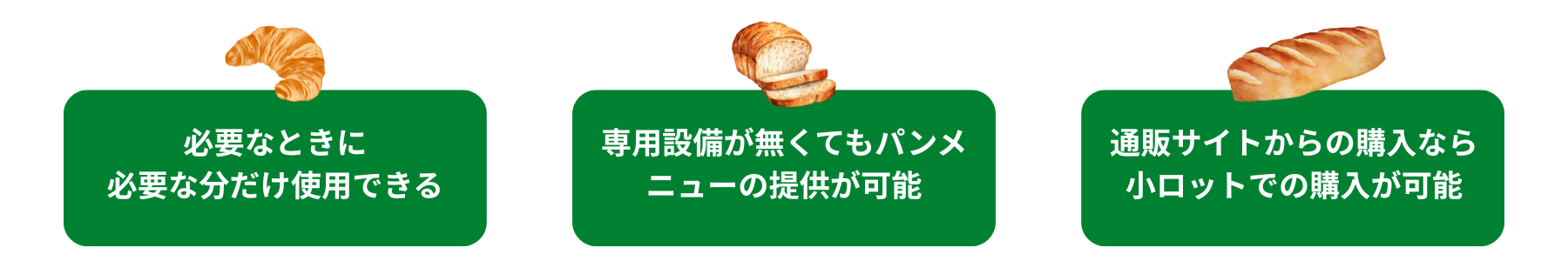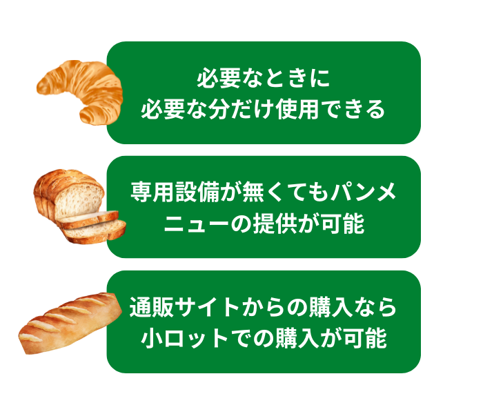 解凍するだけの焼成後冷凍パン、解凍、焼成の2ステップの冷凍パン生地、冷凍のまま揚げるだけのドーナツなど、冷凍パンを使用することで簡単にパンメニューを提供できます。