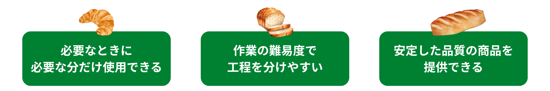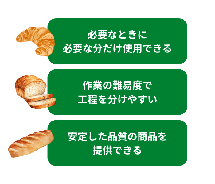 冷凍パン生地を使用すれば、わかりやすい工程でパンの焼成が可能。技術の難易度で工程を分けやすく、その人にあった計画を立案できます。